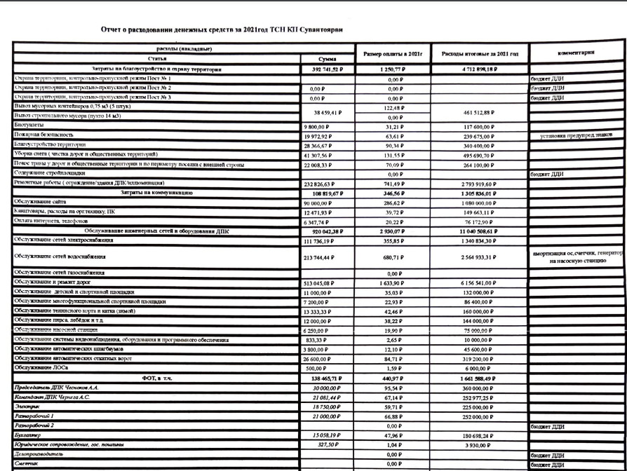 Отчет расходов ТСН "КП "Сувантоярви" за 2021 год