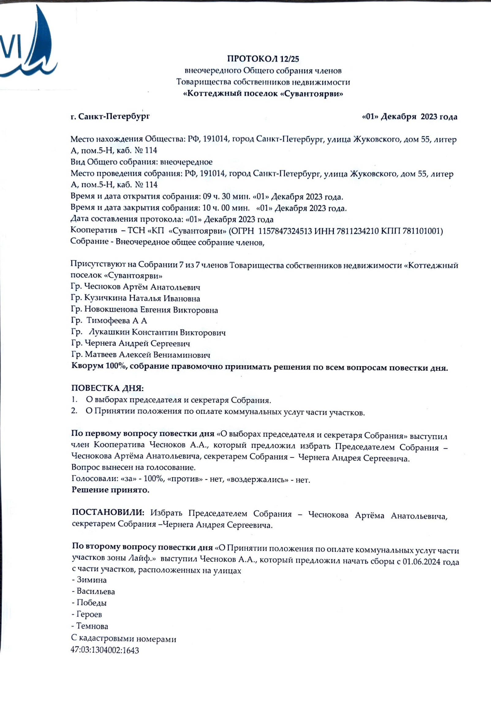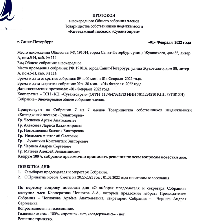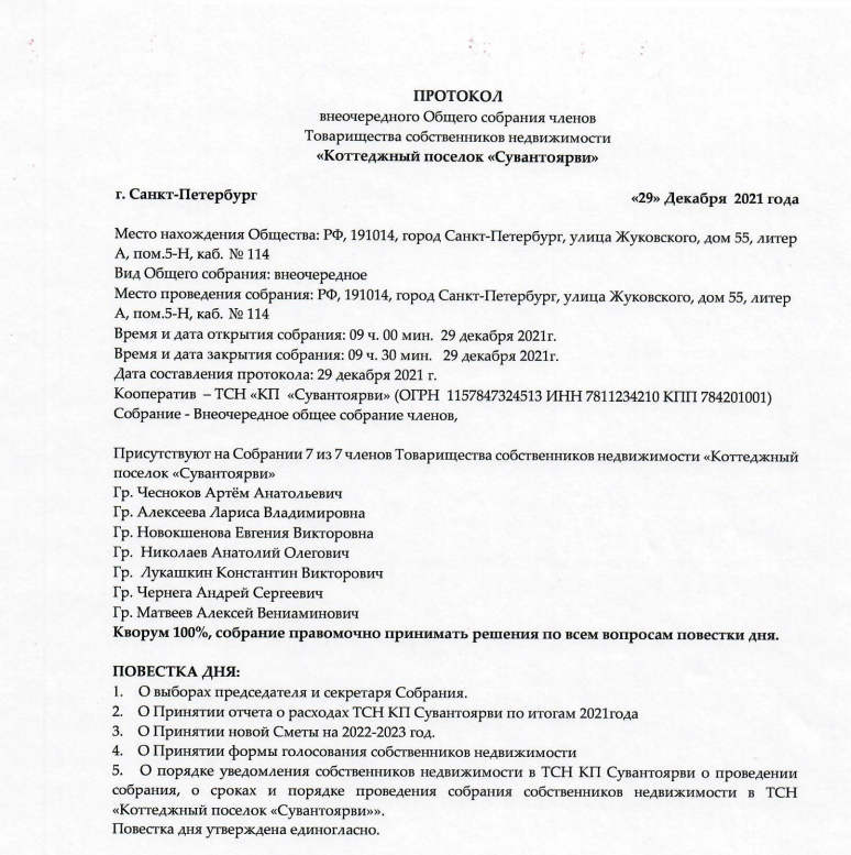 Протокол внеочередного собрания членов ДПК «Сувантоярви» № 18-02 от 13.12.2018