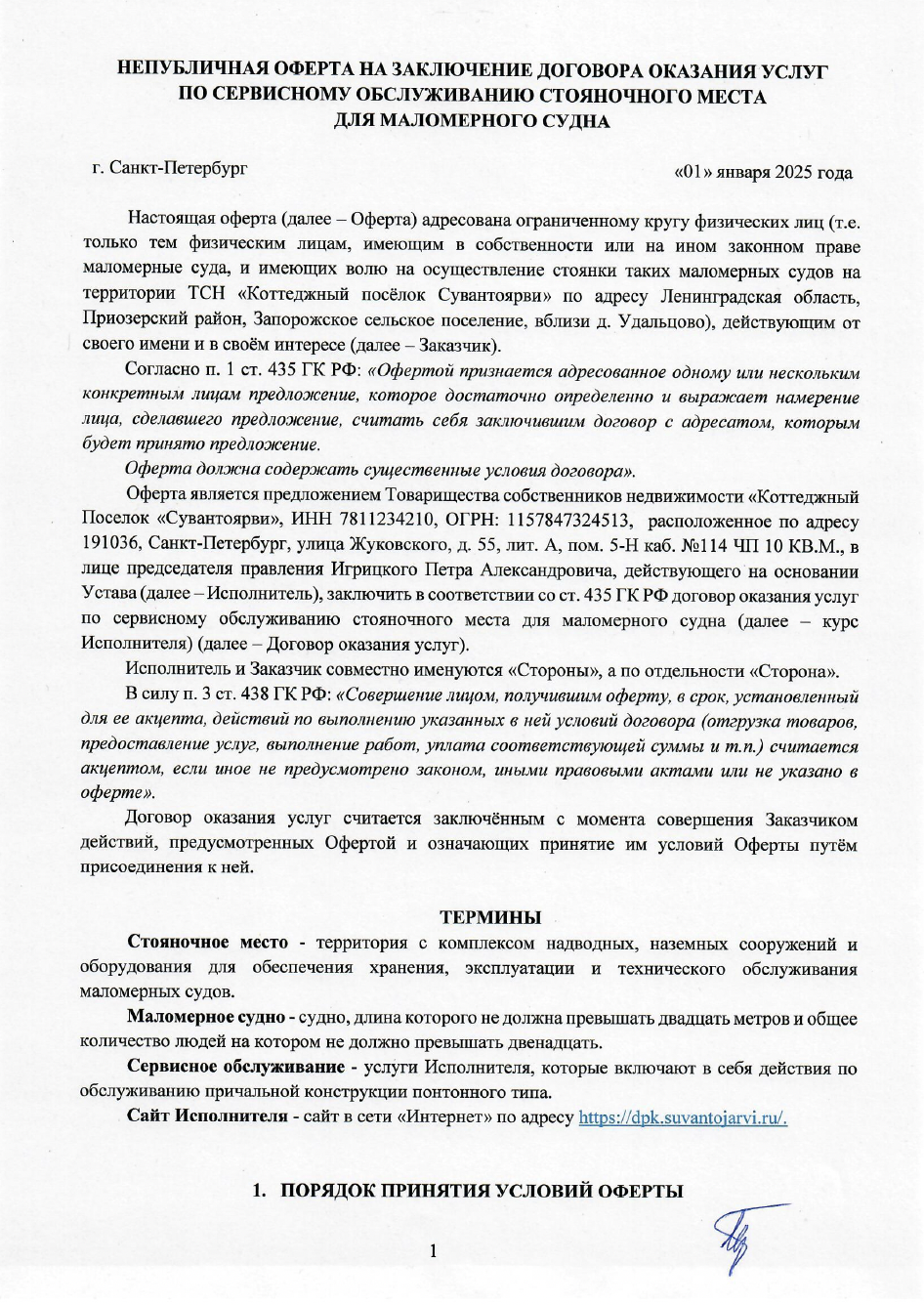 Непубличная оферта на заключение договора оказания услуг по сервисному обслуживанию стояночного места для маломерного судна от 01.01.2025 года